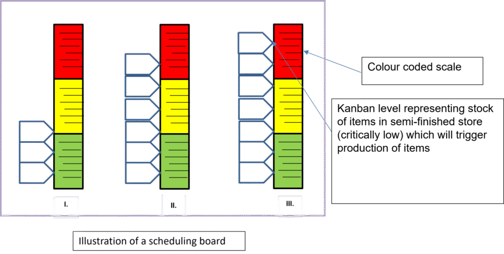 Ø For e.g. For an engine assembly line, Kanban’s will be attached on scheduling board which has “color-coded scale”.
