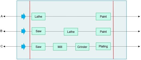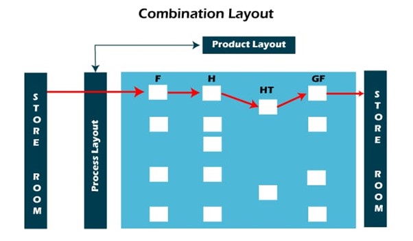 3. Combination Layout: When there are multiple types of products & the quantities are on the higher side, Process layouts arranged in a line in a sequential manner are implemented. Simply the machines performing similar functions are grouped, and these groups are arranged in sequences to manufacture products of different specifications in large quantities.