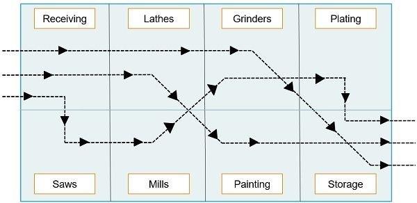 With this approach, you can establish a Plant with a functional arrangement of the layout, where the Product will move to different areas as per its process route & then finally get finished at the common assembly or FG area/process. A plant with non-standardized products should opt for such a layout.